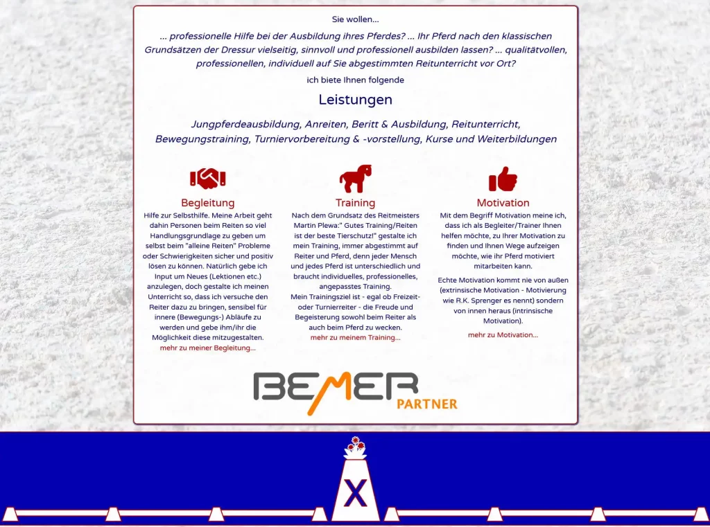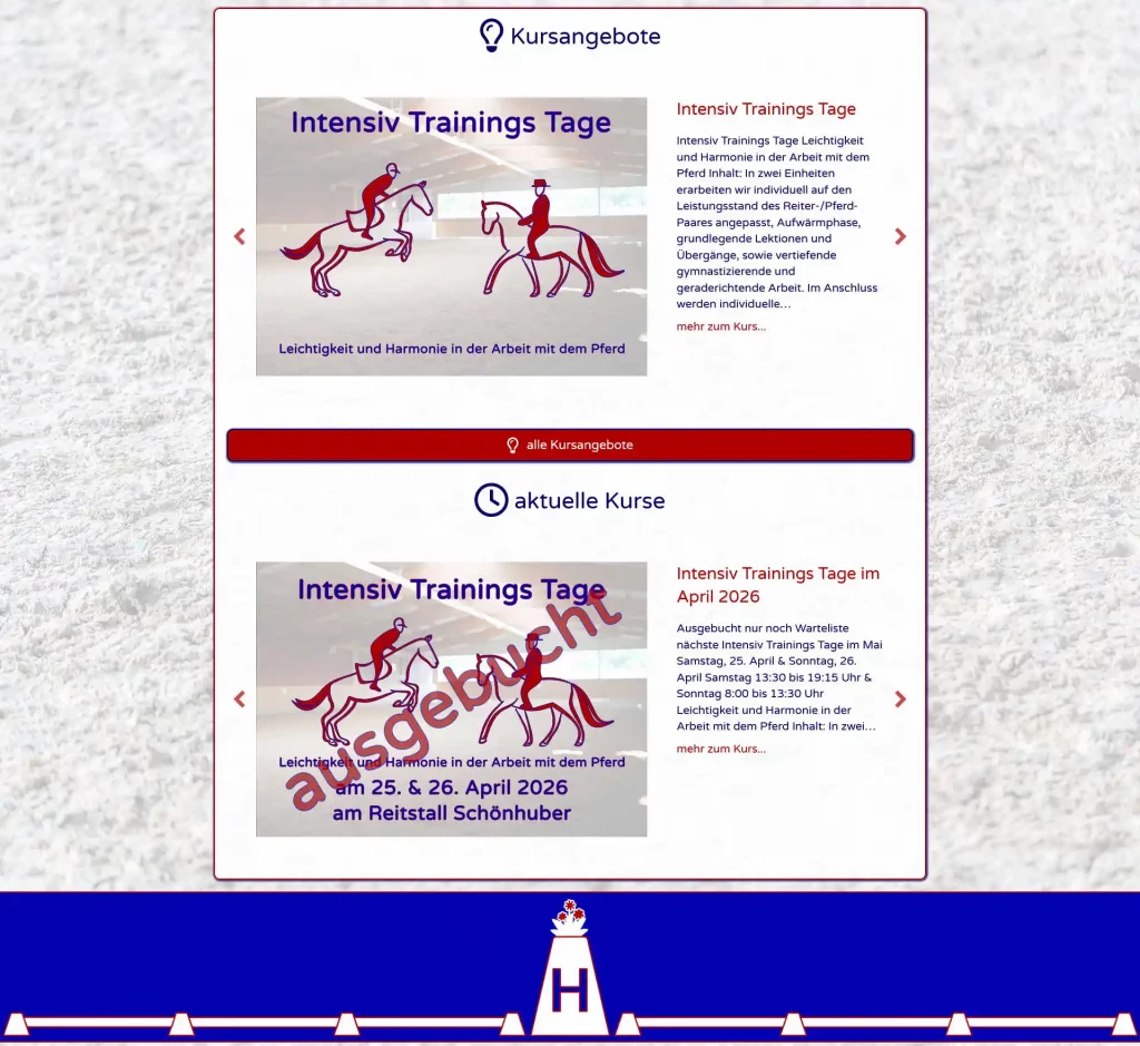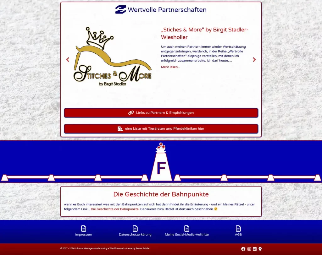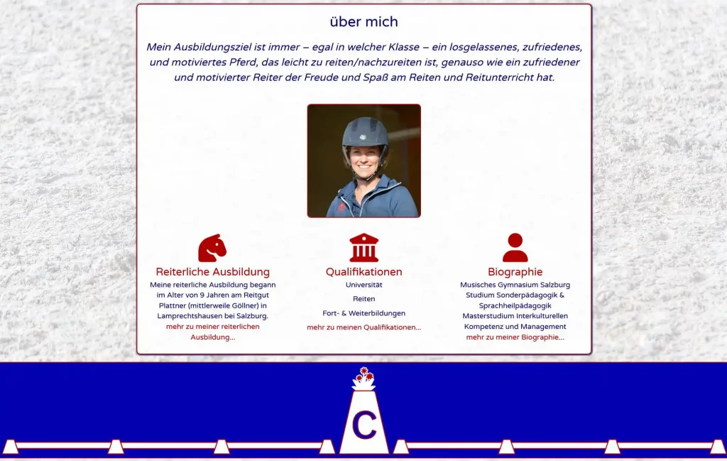 Es ist geschafft đ es etwa lĂ€nger gedauert als gedacht aber ich bin mit dem Ergebnis sehr zufrieden đđđ Die Webseite von Johanna (Dressur Ausbildung Mairinger ) ist komplett ĂŒberarbeitet und hat ganz neues Design bekommen. An dieser Stelle mein herzliches Dankeschön an alle die mitgeholfen haben â allen voran natĂŒrlich Johanna â Richard ( Richard Obdrzalek (Bildagentur von Schick) ) der viele der wunderschönen Fotos geschossen hat, Mimi ( Mimi Villgrattner ) die sich an der Grafik fĂŒr die Bahnpunkte beteiligt hat, Michaela und Stephan Schönhuber und die Familie Bergmann wo wir die Fotos machen durften.